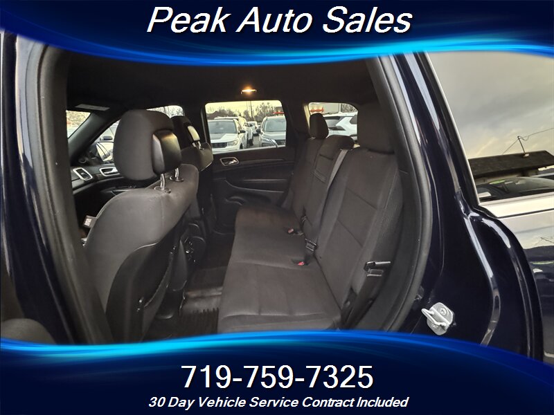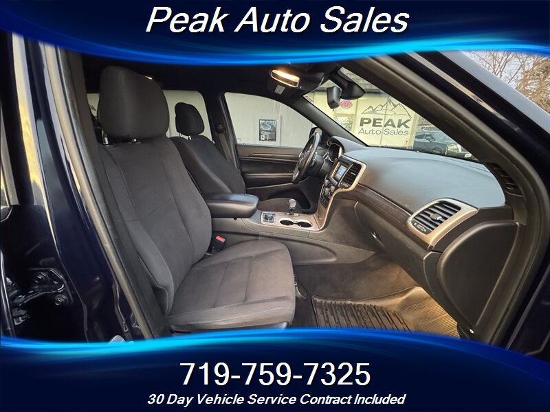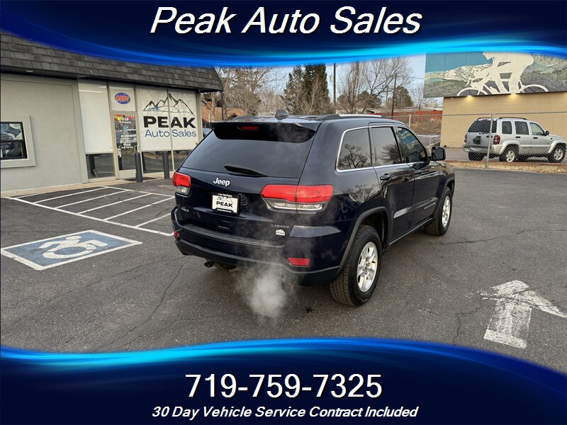 2014 Jeep Grand Cherokee Laredo — True Blue Pearl Coat exterior with a Black interior. Powered by the 3.6L Pentastar V6 producing 290 hp and 260 lb-ft of torque, this Grand Cherokee delivers confident on-road performance and smooth acceleration. EPA-rated at 17 MPG city and 24 MPG highway, it balances everyday drivability with capable V6 power.