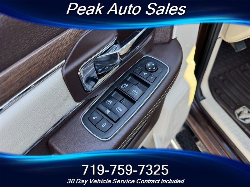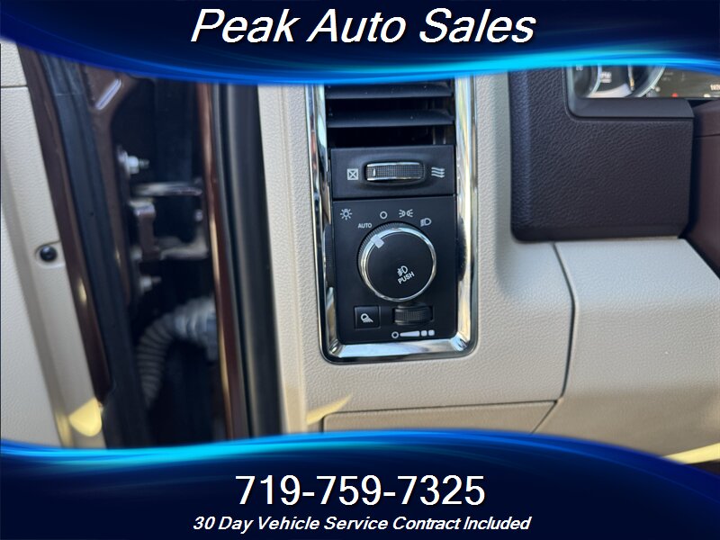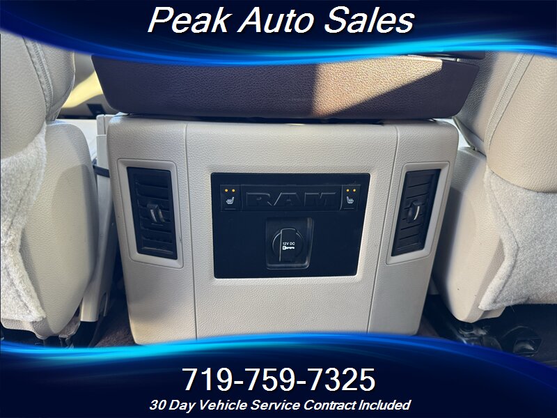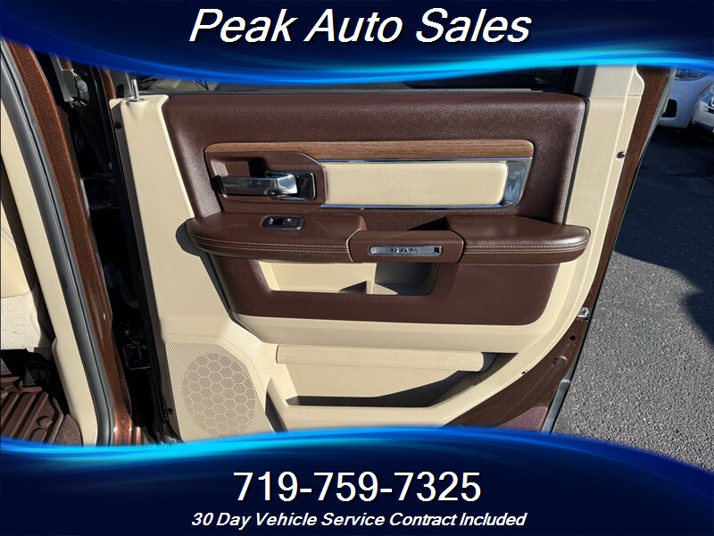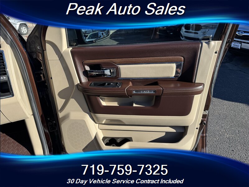 - Interior comfort and trim: Premium leather-trimmed seating in Canyon Brown with Light Frost Beige accents, power-adjustable front seats, and a spacious front center console. Dual-zone automatic climate control provides separate temperature control for driver and front passenger. High-quality materials and wood- or metallic-look trim accents typical of the Laramie package.