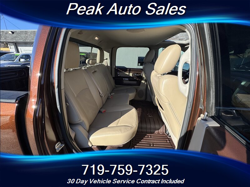 - Exterior and convenience: Laramie-bright chrome exterior accents including grille and bumpers, alloy wheels, fog lamps, power heated side mirrors, and remote keyless entry. Tailgate and bed features are factory-installed to support light- to medium-duty utility and towing. Factory exterior paint is the two-tone Western Brown with Bright Silver Metallic Clear Coat.