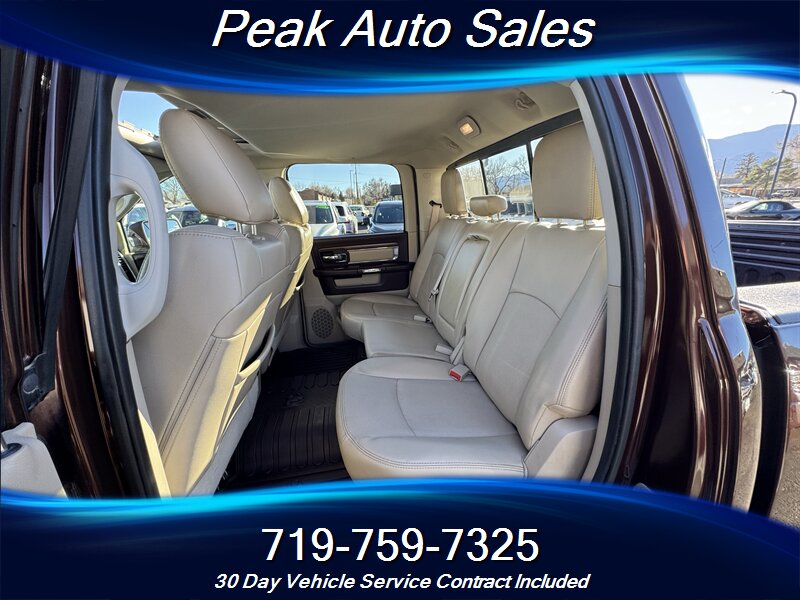 2014 RAM 1500 Laramie — HARD TO FIND COLOR COMBO = Western Brown / Bright Silver Metallic Clear Coat exterior with Canyon Brown / Light Frost Beige leather interior. Powered by the 5.7L HEMI V8 producing 395 hp and 407 lb-ft of torque, this Ram is equipped with the HEMI’s cylinder-deactivation technology for improved fuel efficiency and the factory automatic transmission. Fuel economy is rated at approximately 15 MPG city and 21 MPG highway. This truck has below 108,000 miles (averaging under 9,000 miles per year), shows excellent overall condition, and comes with a clean CARFAX.