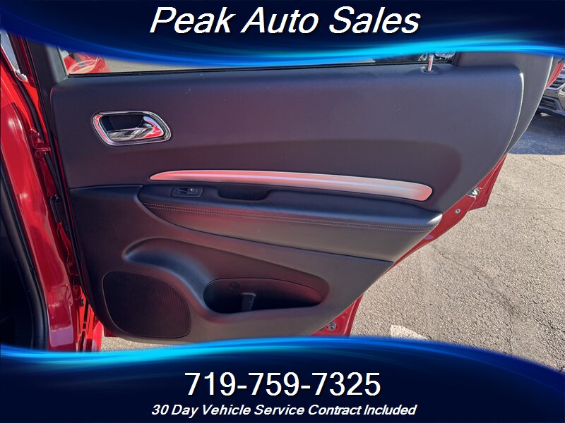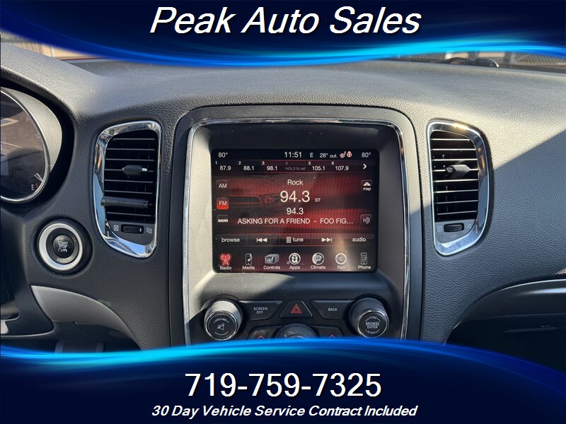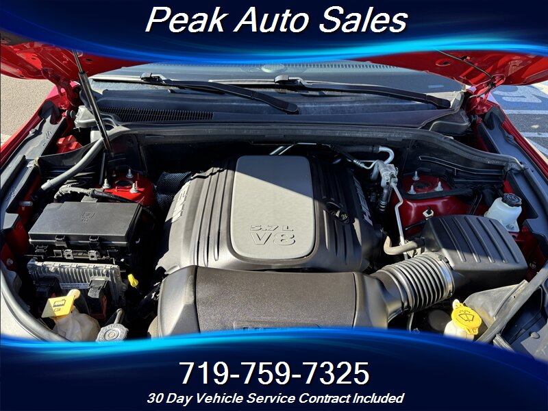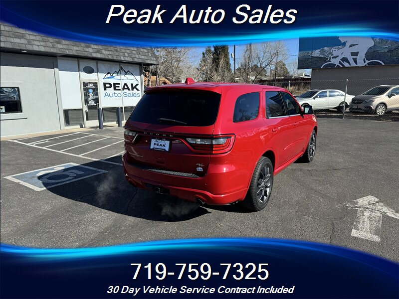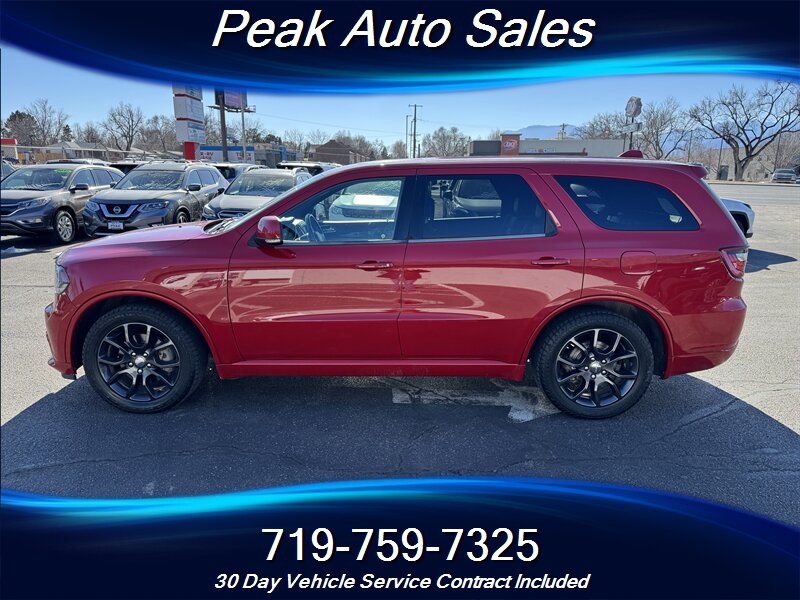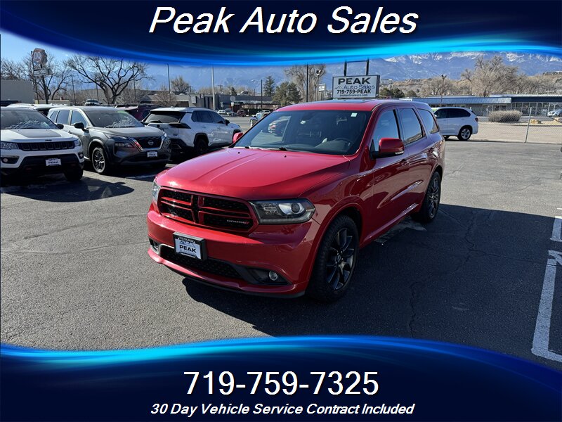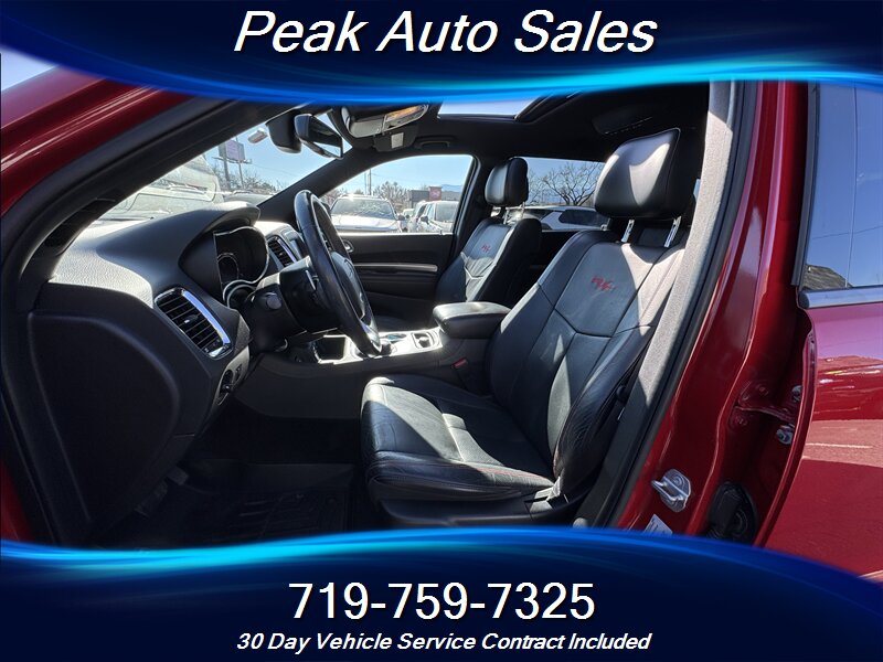 2015 Dodge Durango R/T — powered by the HEMI 5.7L V8 producing 360 hp and 390 lb-ft of torque — finished in Redline 2 Pearl Coat with a Black interior. This vehicle is in excellent overall condition and shows a clean CARFAX. EPA fuel economy is rated at 14 MPG city and 22 MPG highway.