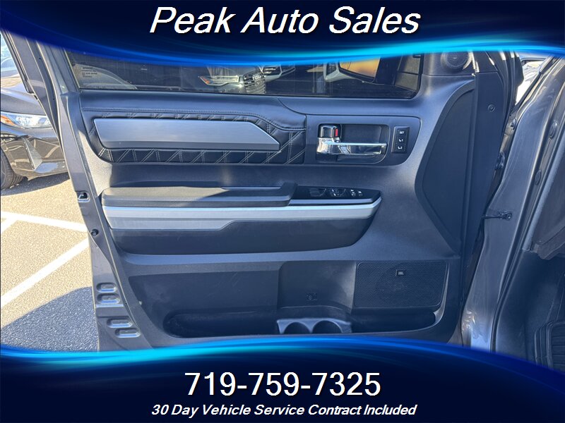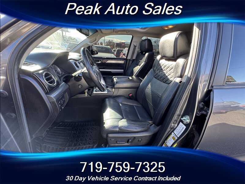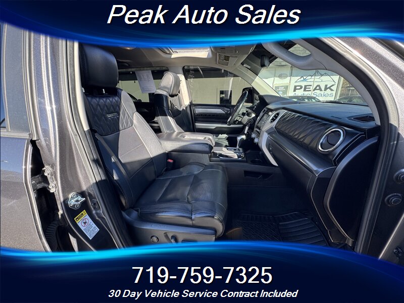 The exterior of the Tundra Platinum is equipped with a host of standard features that enhance both functionality and style. The vehicle comes with a set of 20-inch alloy wheels that not only provide a sturdy foundation but also add to the truck's bold appearance. The front grille, finished in chrome, features a stylish design that complements the overall look of the vehicle while enhancing airflow to the engine. Additionally, the Tundra Platinum is equipped with LED daytime running lights and fog lights, which improve visibility and safety in various driving conditions. A power tilt/slide sunroof adds an extra touch of luxury, allowing you to enjoy fresh air and sunlight during your travels.