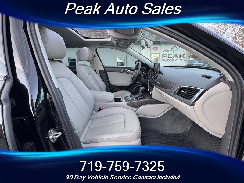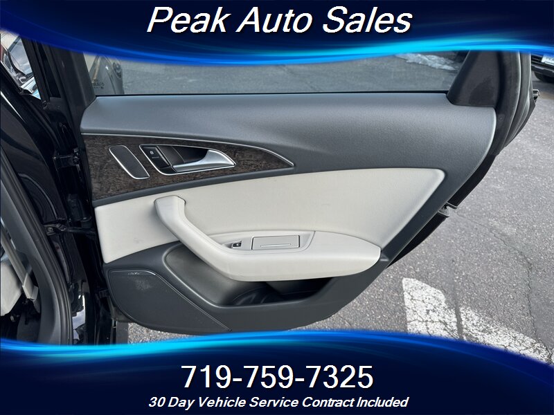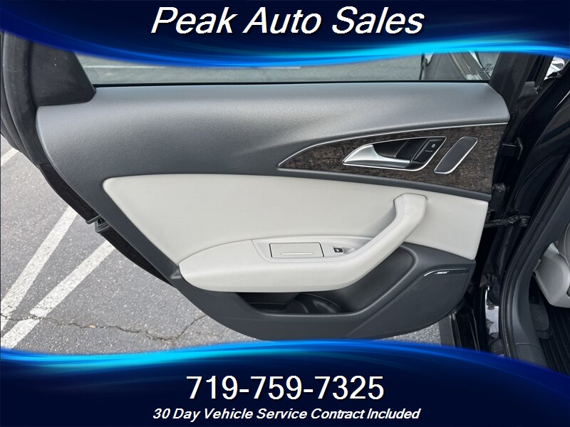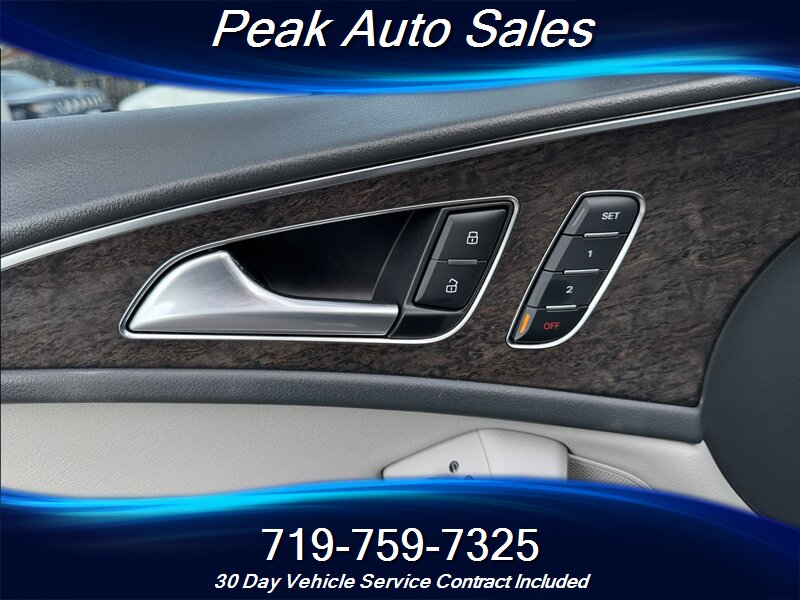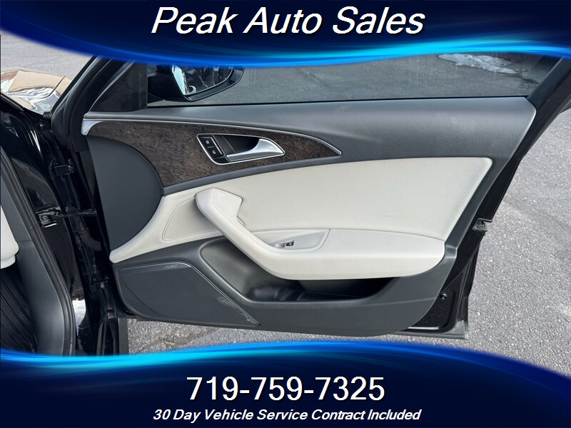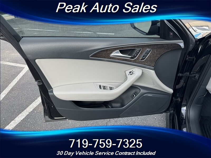 Finished in Brilliant Black, the A6 presents Audi’s clean, understated luxury sedan styling. Factory exterior features include LED daytime running lights and taillights, projector-style headlights, heated power side mirrors, power-operated windows and locks, and alloy wheels. Rain-sensing windshield wipers and a sunroof are part of the convenience and comfort package on this model.