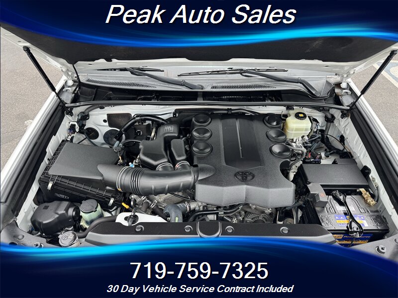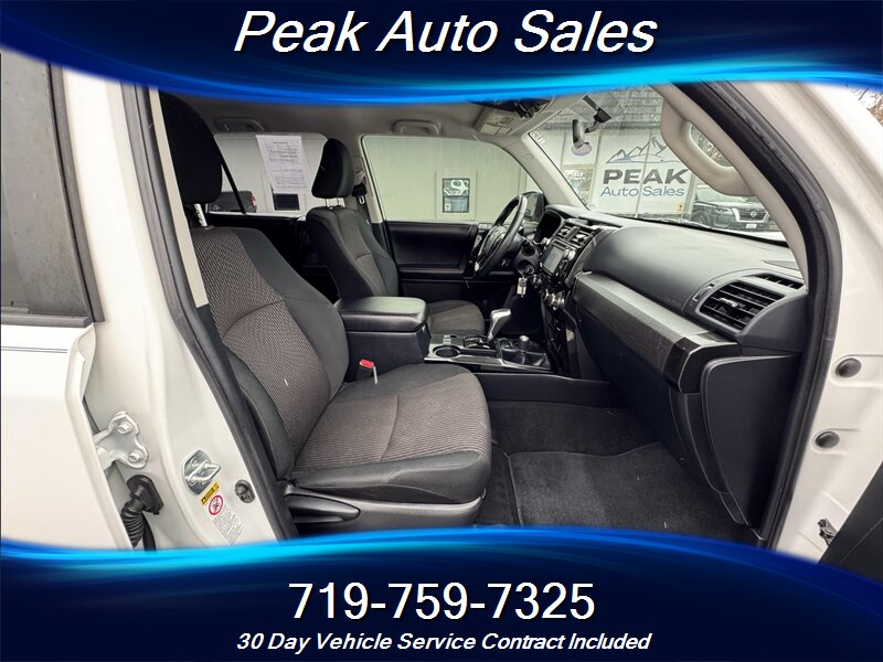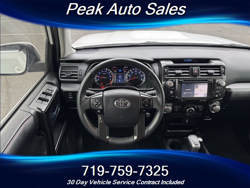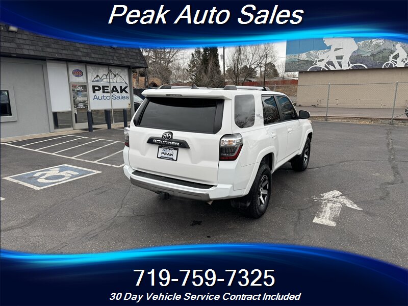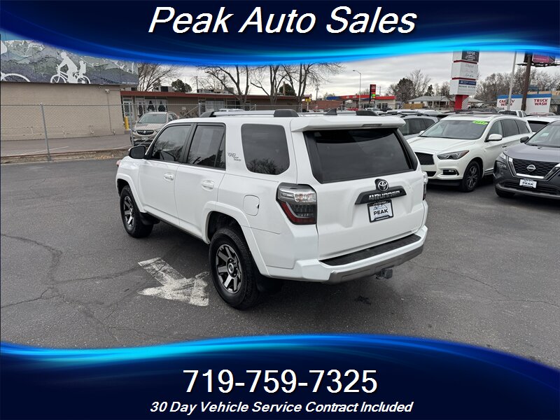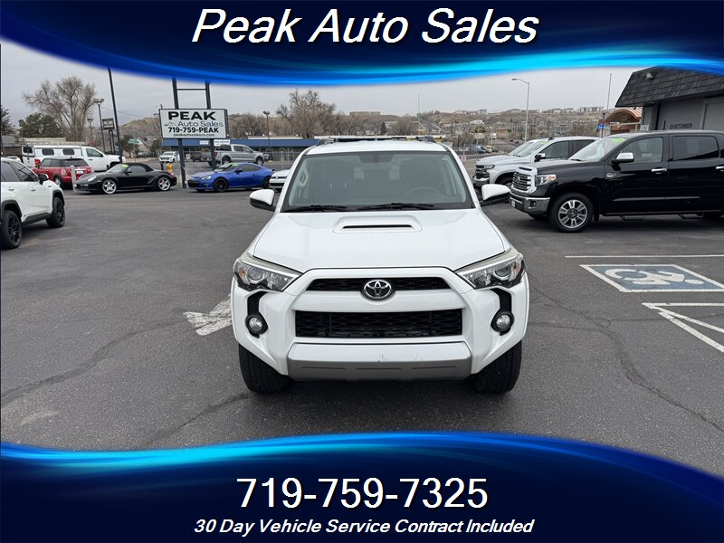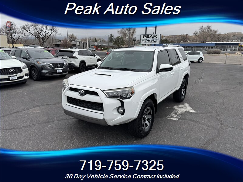 2017 Toyota 4Runner TRD Off-Road — Super White exterior with Black interior. This 4Runner is powered by Toyota’s 4.0L V6 producing 270 hp and 278 lb-ft of torque, paired with a 5-speed automatic transmission. The vehicle achieves an EPA-estimated 17 MPG city and 20 MPG highway. It is in excellent overall condition and comes with a clean CARFAX report.