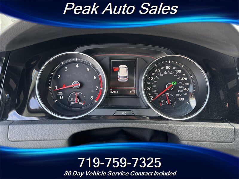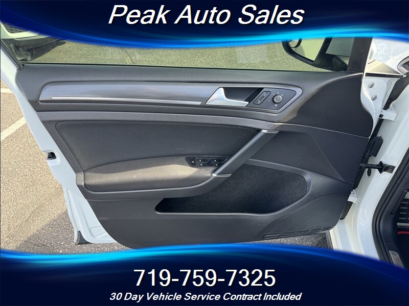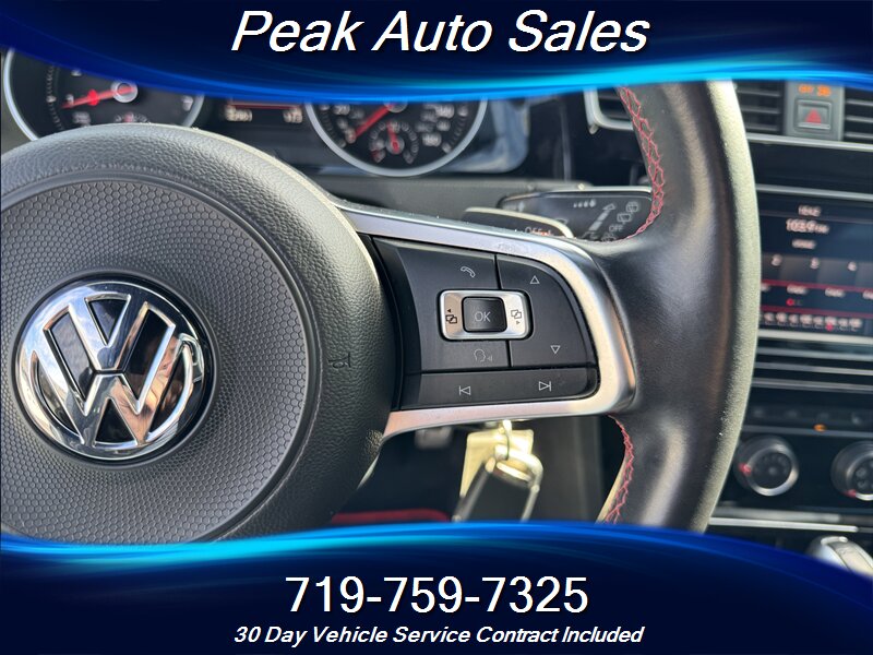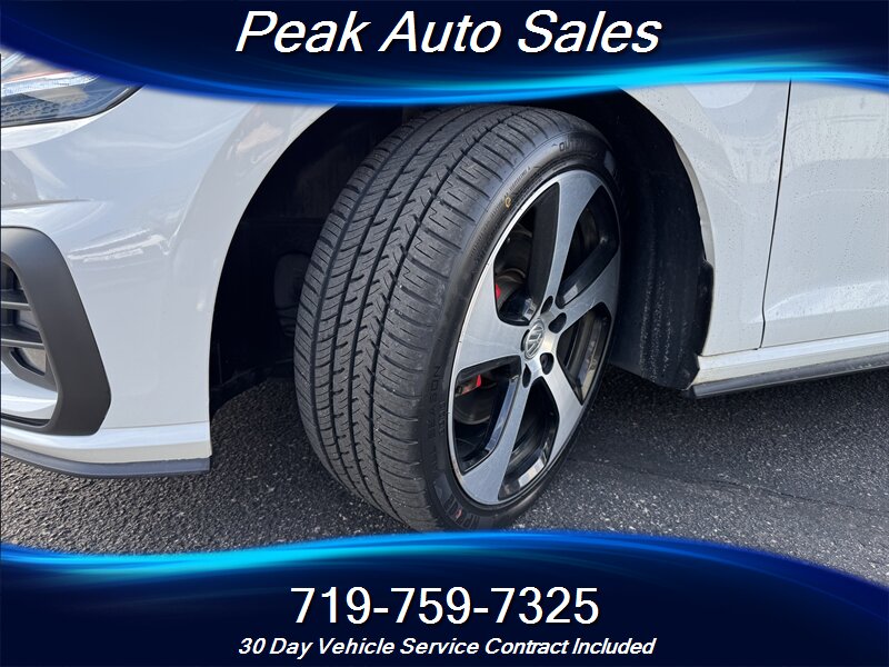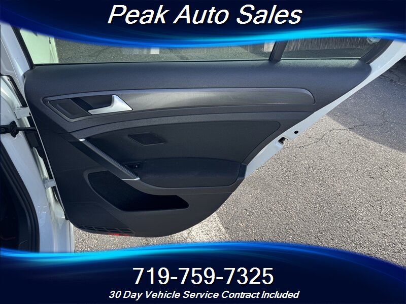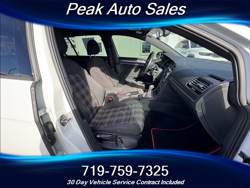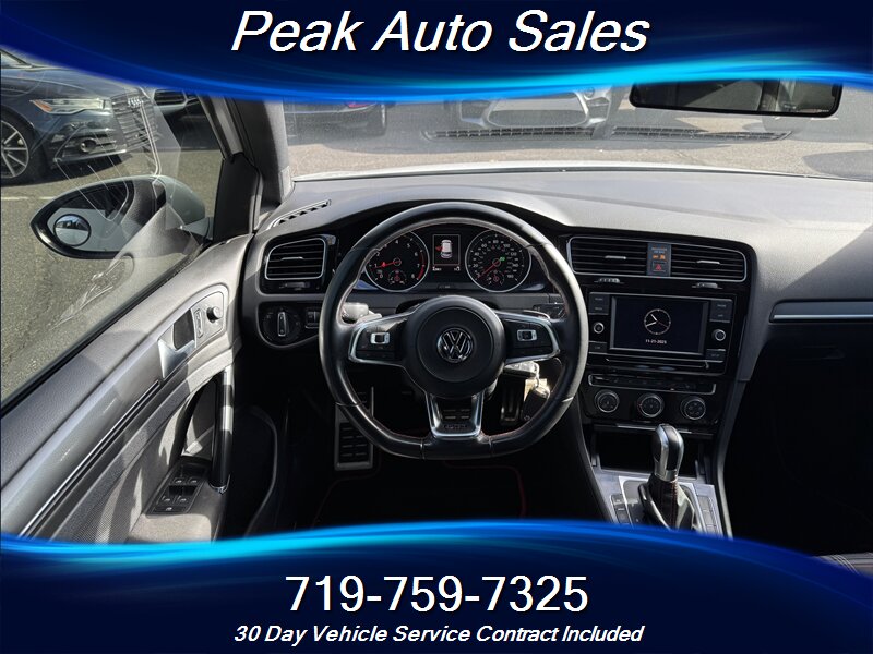 The exterior of the 2018 Golf GTI S is finished in a classic Pure White, a color that enhances the vehicle's sporty and sophisticated aesthetic. The sleek lines and aggressive stance give the hatchback a dynamic presence on the road, while the distinctive GTI badging and signature red accents provide a nod to its performance pedigree. The front fascia features bi-xenon headlights with LED daytime running lights, ensuring optimal visibility while adding a modern touch to the overall design. The 18-inch Austin alloy wheels further contribute to the sporty look, perfectly complementing the vehicle’s design.
