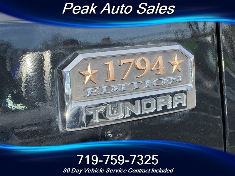 The exterior of this Tundra is finished in a striking Midnight Black Metallic, providing a sleek and bold appearance that stands out on any terrain. The 1794 Edition is known for its unique styling cues, including chrome accents and a distinctive front grille that enhance its commanding presence on the road.
